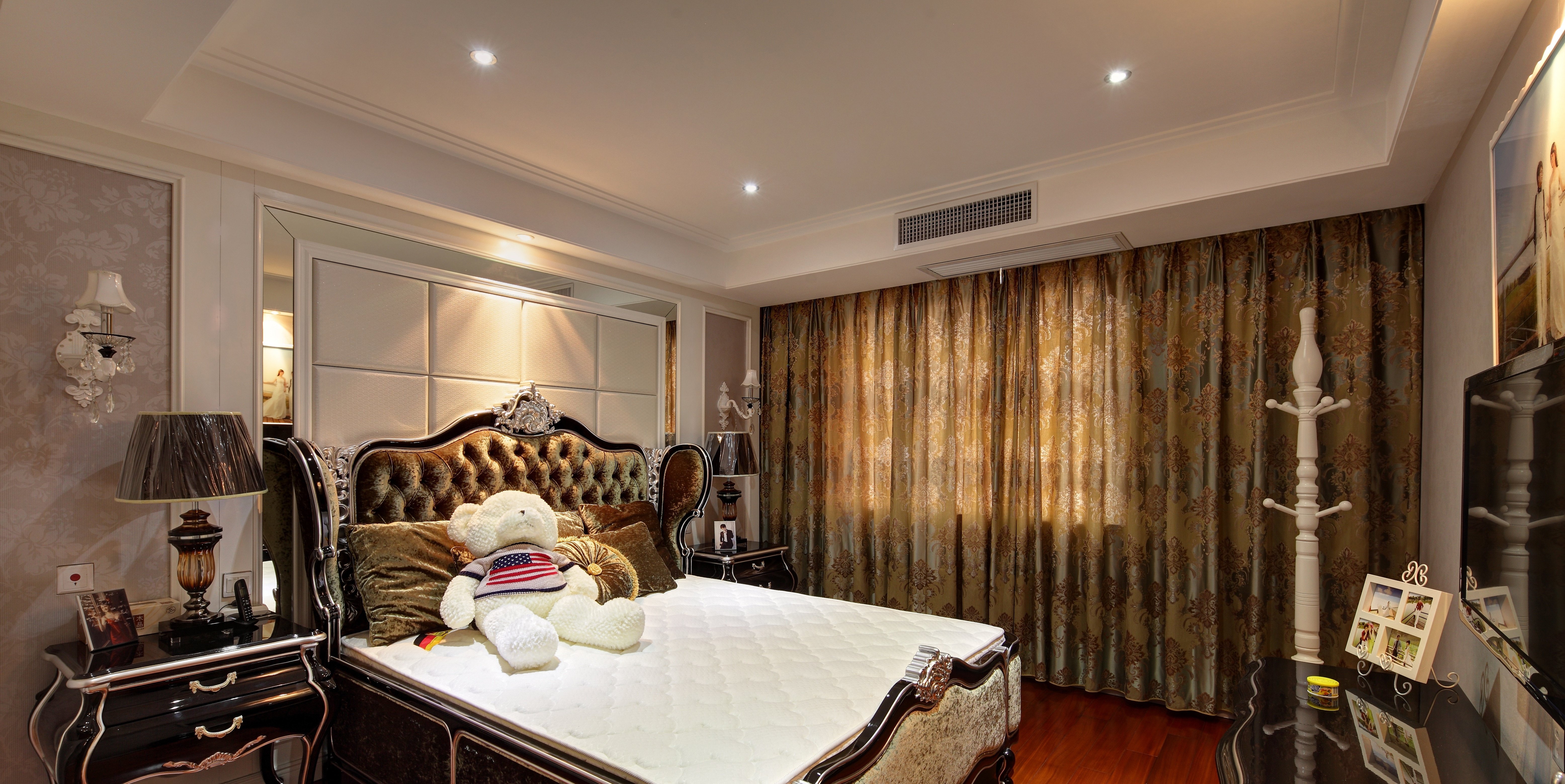 简欧风格公寓家装施工图,公寓室内装饰CAD施工图纸下载,本案为三室两厅的平层公寓,设计师以白色为基调,简欧的设计手法来营造现代奢华的感觉。进门玄关处采用整体定制柜大面积装饰墙面,增加其储物功能。挂壁式缸成为进门一景,在风上也有一定的寓意,丰富了墙面元素。客厅餐厅在一条主动线上,使视觉空间更为开阔,在墙面造型的设计上都采用了银镜与壁纸做成对称造型来装饰