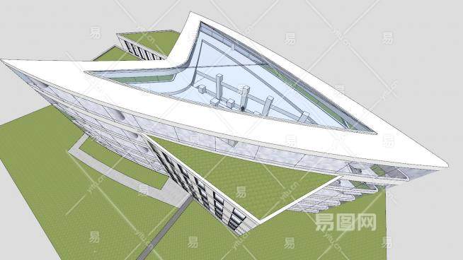 这是现代六层建筑办公SU模型,办公大由《星际迷航》中的通讯徽章形状设计而成,六层电梯,玻璃,天,大中庭。现代六层建筑办公SU模型下载_sketchup图大师SKP模型