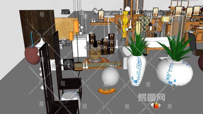 中式风格家具门花瓶桌子雕花SU模型下载_sketchup草图大师SKP模型