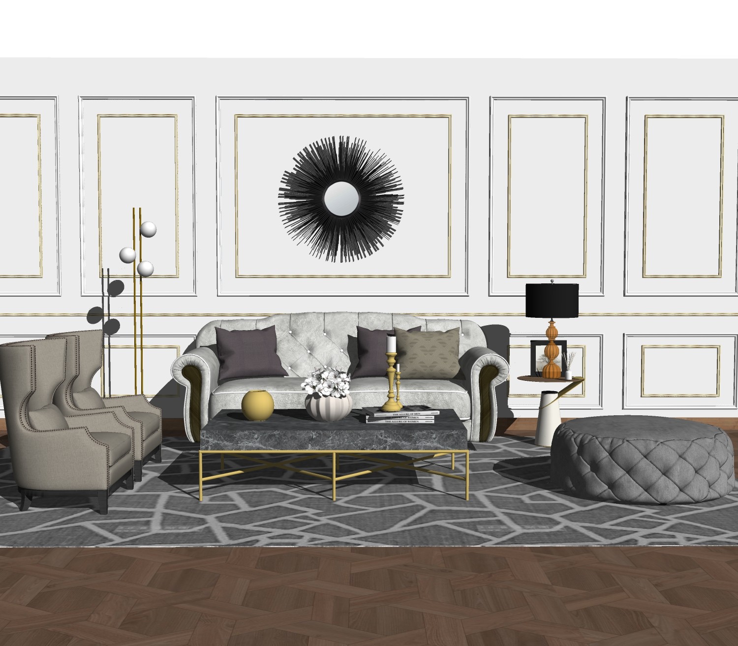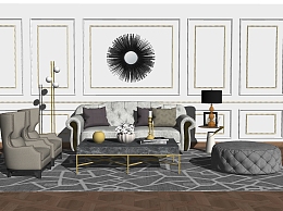 美式轻奢皮革沙发组合su模型,沙发组合skp模型下载