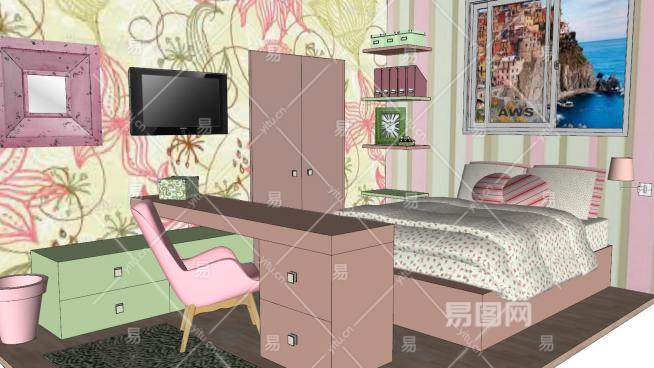 现代整体女孩儿童房SU模型下载_sketchup草图大师SKP模型