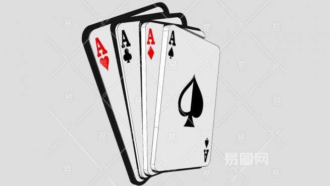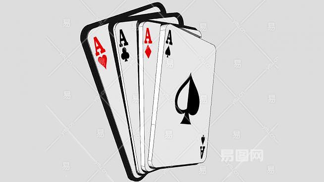 这是四条A扑克牌SU模型,扑克(英文:Poker),代指两种含义:一是指纸牌(playing cards);二是泛指以用纸牌这种游戏道具来玩的游戏,称为扑克游戏,如德州扑克。一副扑克牌有54张牌,其中52张是正牌,另2张是副牌(大王和小王)。52张正牌又均分为13张一组,并以黑桃、红桃、梅、方块四种色表示各组,每组色的牌包括从1-10(1通常表示为A)以及J、Q、K标示的13张牌,玩法千变万化,多种玩法。四条A扑克牌SU模型下载_sketchup图大师SKP模型