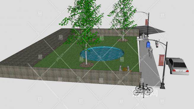 这是现代小型公园SU模型,公园汽车木、自行车等。现代小型公园SU模型下载_sketchup图大师SKP模型