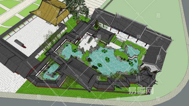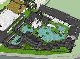 中式园林池塘景观SU模型下载_sketchup草图大师SKP模型