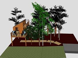 针叶阔叶乔木树下木屋SU模型下载_sketchup草图大师SKP模型