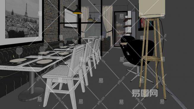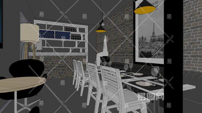 这是现代工业风西餐厅sketchup模型,餐厅(dining room)就是指在一定场所,公开对一般大众提供食品、饮料等餐饮的设施或公共餐饮屋。现代工业风西餐厅sketchup模型下载_sketchup图大师SKP模型