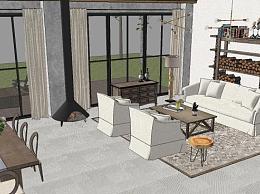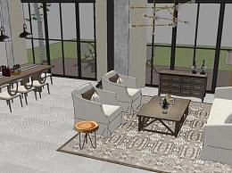 LOFT复古工业风客厅餐厅SU模型下载_sketchup草图大师SKP模型