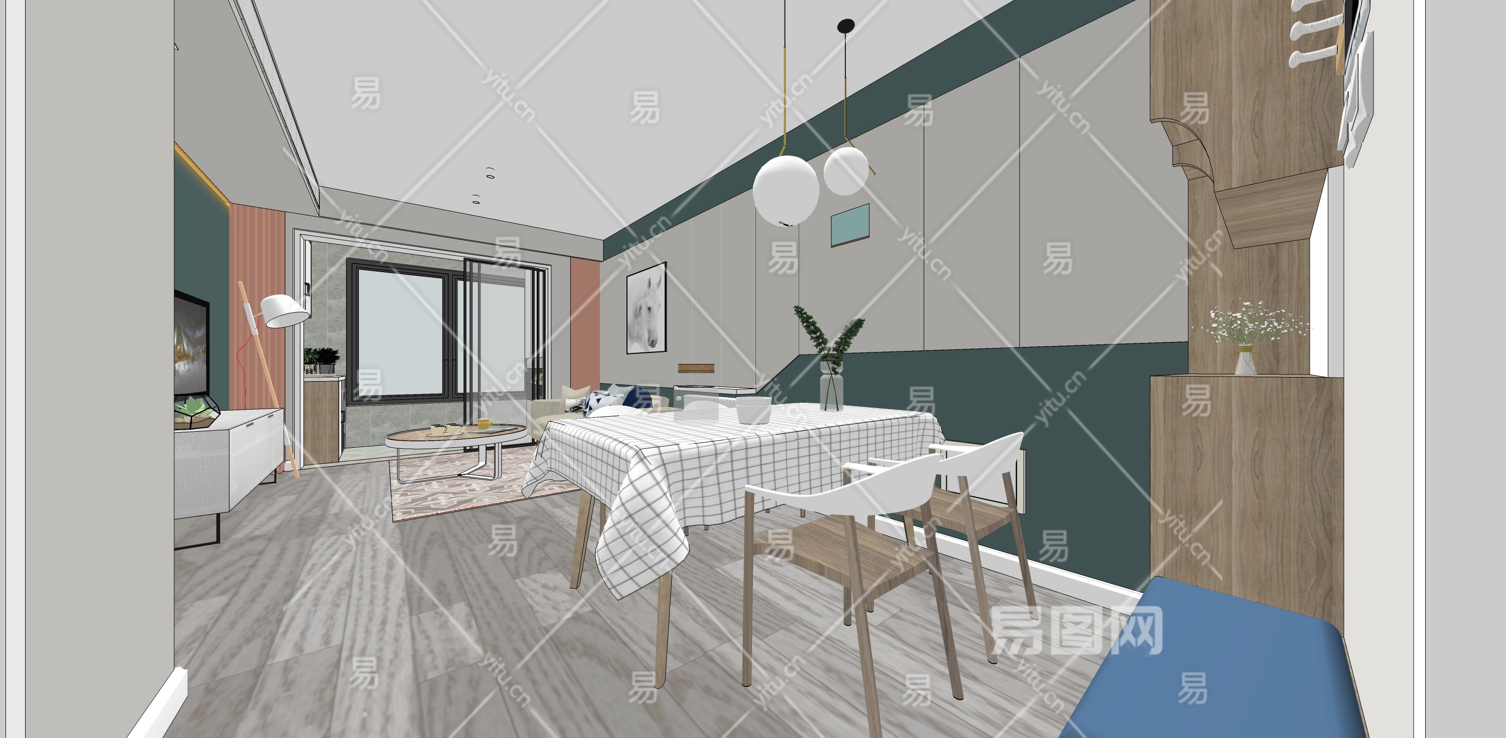 北欧风格小户型客餐厅卧室书房su草图模型下载