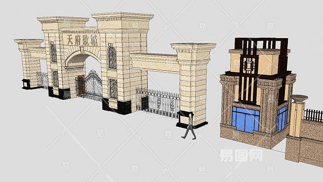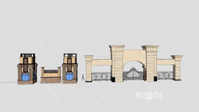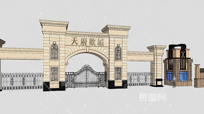 这是欧式大门SU模型,一种作为防护,用来防护治安员不被风吹雨淋防护。多见于各类公共场所中,如:街道,学校,工厂大门口,交警大队,高速公路等。欧式大门SU模型下载_sketchup图大师SKP模型