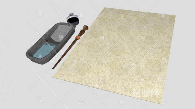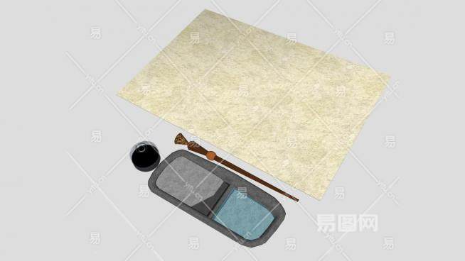 这是墨书法工具包SU模型,笔墨纸砚是中国独有的文书工具,即文房四宝。笔、墨、纸、砚之名,起源于南北朝时期。历史上,“笔、墨、纸、砚”所指之物屡有变化。墨书法工具包SU模型下载_sketchup图大师SKP模型