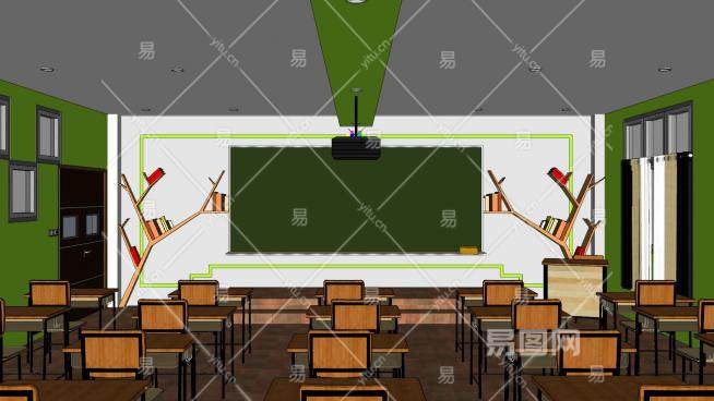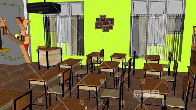学校教室室内书架课桌SU模型下载_sketchup草图大师SKP模型