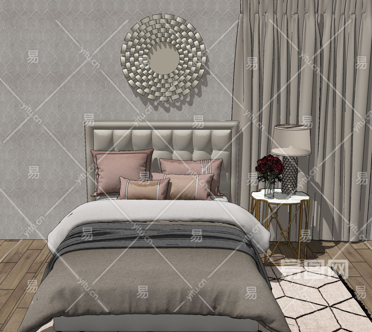 简欧现代简欧奢华双人床床具,边几,台灯,花卉,墙饰,装饰镜su草图模型下载