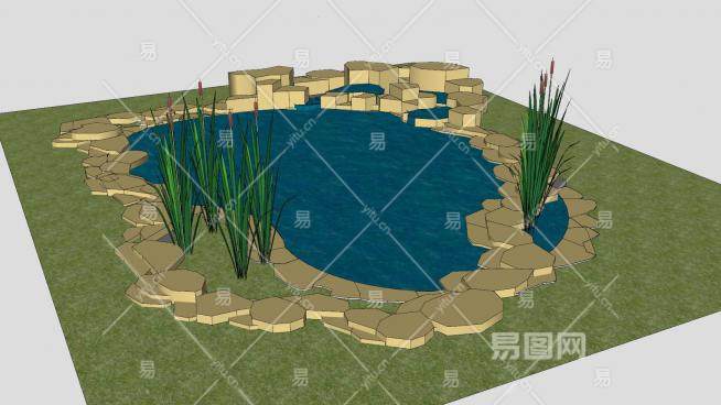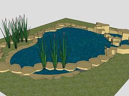 鱼塘水景和瀑布设计SU模型下载_sketchup草图大师SKP模型