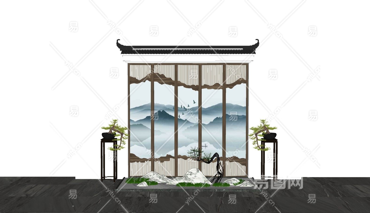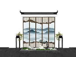 • 新中式禅意民宿别墅会所屏风景墙庭院水景景观小品SU模型