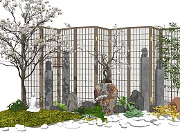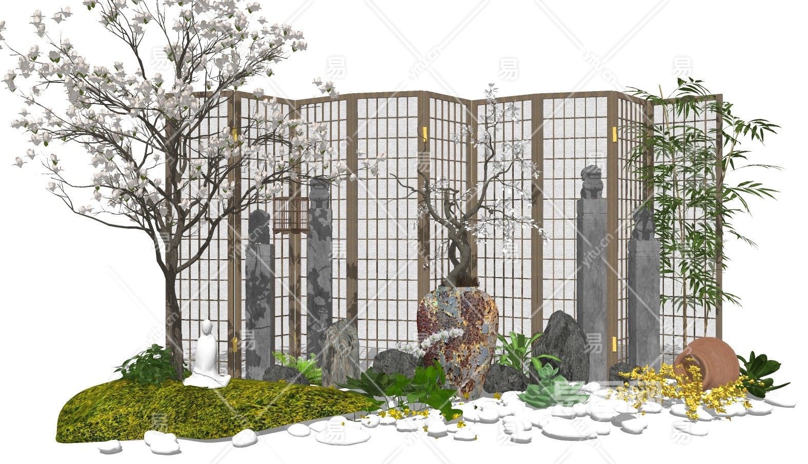 • 新中式禅意民宿别墅会所屏风景墙庭院水景景观小品SU模型