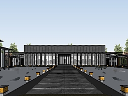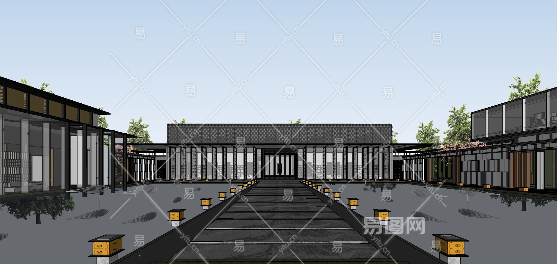 69新中式示范区售楼处,售楼处入口大门,高档住宅售楼中心,中式会所,中式庭院景观,隔断雕花su草图模型下载