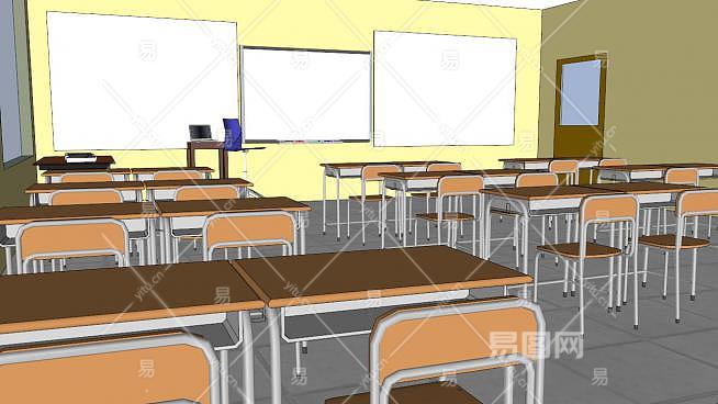 这是学生课桌椅su模型,教室靠讲台的墙上有黑板或白板,是教师讲课、布置作业方。后面是学生的座位。在中国,中小学的课桌布置一般有四组,每组有八至九桌,每桌坐两个学生。学生课桌椅su模型下载_sketchup图大师SKP模型