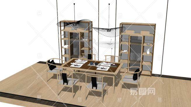 新中式木质桌椅组合SU模型下载_sketchup草图大师SKP模型
