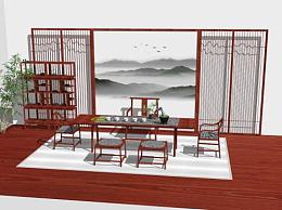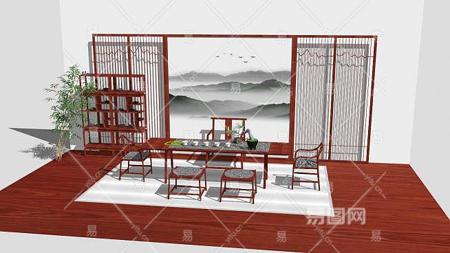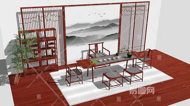 新中式红色桌椅组合SU模型下载_sketchup草图大师SKP模型